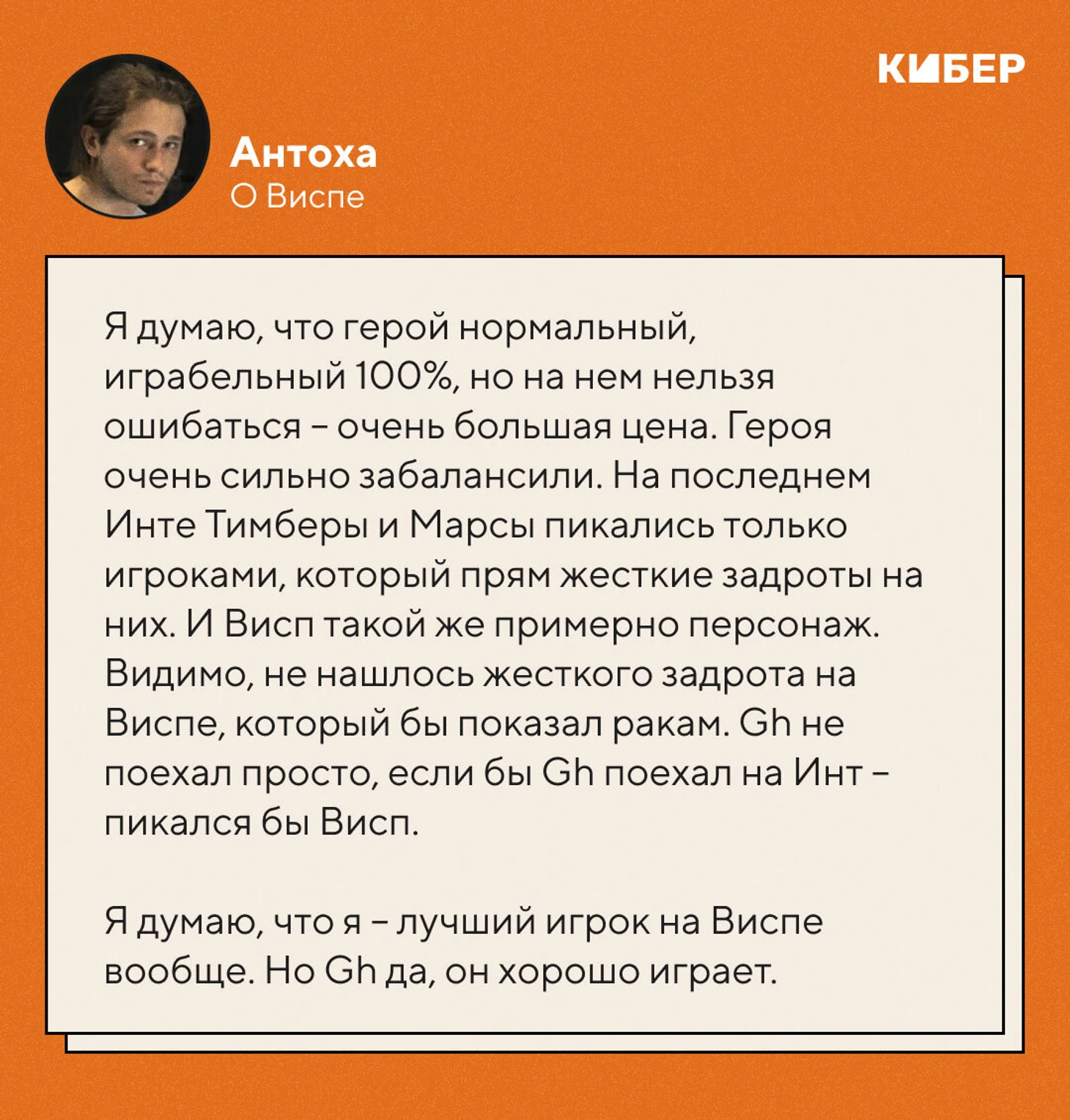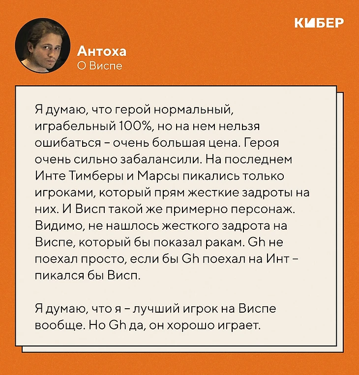 – Я думаю, что герой нормальный, играбельный 100%, но на нем нельзя ошибаться – очень большая цена. Героя очень сильно забалансили. Есть персонажи, которые очень сильны концептуально, и их забалансили: такие как Тимбер, Марс. На последнем Инте Тимберы и Марсы пикались только игроками, который прям жесткие задроты на них. И Висп такой же примерно персонаж. Видимо, не нашлось жесткого задрота на Виспе, который бы показал ракам. Gh не поехал просто, если бы Gh поехал на Инт – пикался бы Висп.
