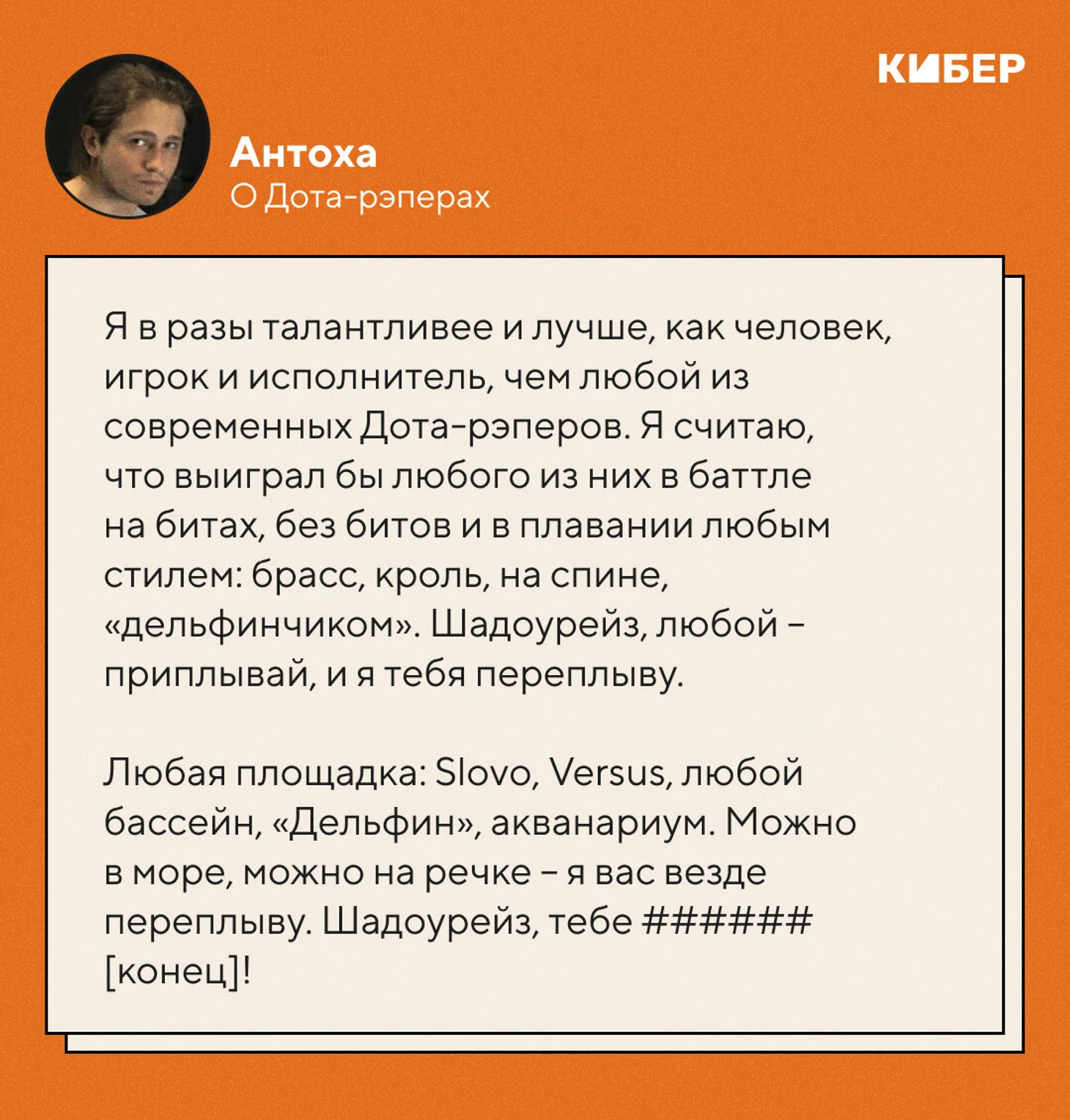 – Я считаю, что выиграл бы любого Дота-рэпера в баттле на битах, без битов и в плавании любым стилем: брасс, кроль, на спине, «дельфинчиком». Шадоурейз, любой – приплывай, и я тебя переплыву.