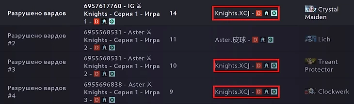 К спорным эпизодам с трансляции добавились и несколько статистических аномалий из подозрительных матчей, вроде кучи сломанных Обсов. Например, саппорт Knights XCJ лидирует в 3 пунктах из 4 по рекордному количеству разрушенных вардов в матчах китайской DPC-лиги. Все рекорды он поставил как раз в матчах против вышеупомянутых китайских команд.