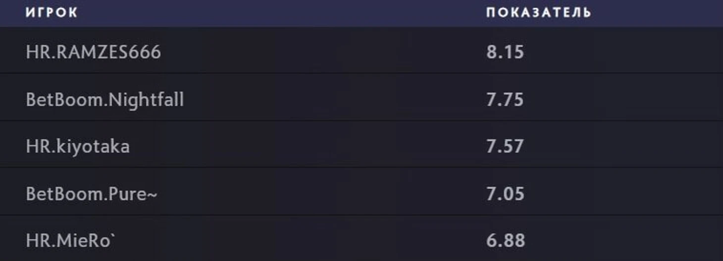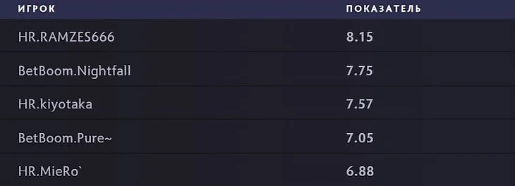 Интересно, что в топ-5 этого списка находятся все коры HellRaisers, но что еще более удивительно – здесь же два кора BetBoom, у которой второй тур DPC явно не задался. То же присутствие Miero, к примеру, показывает, что командная игра у HR выходит на качественно новый уровень.