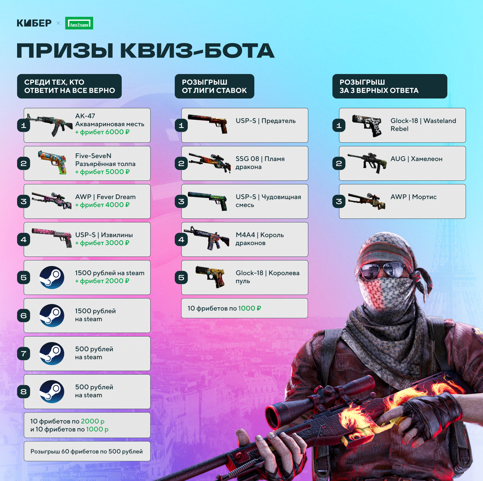 Привет! Квизбот Кибера теперь работает и для фанатов КС. В этот раз мы с друзьями из Лиги Ставок подготовили для вас вопросы к мейджору в Париже. Как обычно, за правильные ответы ты получишь призы.