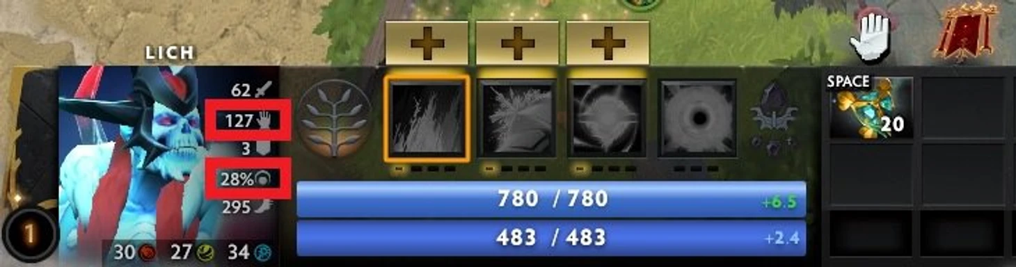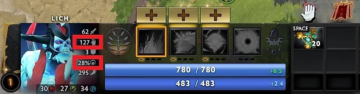 Стоимость здоровья. Большинство способностей в Доте расходуют ману, но некоторые вместо нее расходуют здоровье. Теперь эти способности отображают стоимость HP при их использовании.
