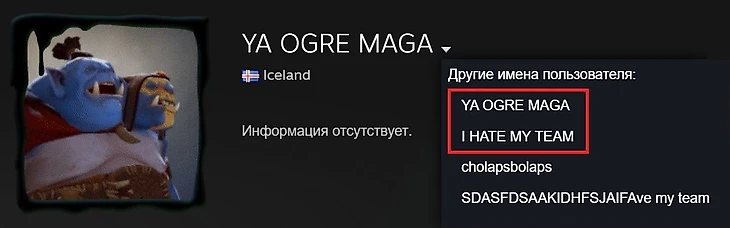 Сам оффлейнер команды поставил ник «Я ненавижу свою команду» и аватарку с Огром. Но потом смягчился и сменил никнейм на «YA OGRE MAGA».