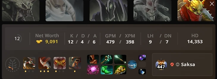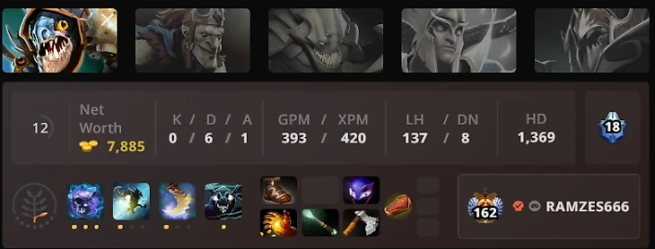 Обратите внимание, насколько плохая игра была у Рамзеса. По итогам игры он нафармил меньше, чем четверка-БХ во вражеской команде.