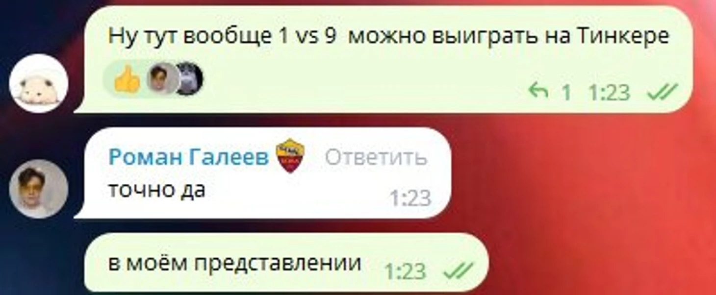 Назовите мне хоть одного игрока на Тинкере в 2023 году на тир-1 и тир-2 сцене? Не Абеда, который в последний раз, по ощущениям, играл на нем еще в Фнатик, а вот сейчас, на этом имбовом герое (к слову, он имбовым становится далеко не сразу, и пик силы у него относительно поздний). Я назову лишь двух игроков, которые сразу пришли на память - Kiyotaka и W1sh- из Монаспы. В.С.Е. Почему вы не забанили этого героя, когда против вас уже был БХ и Бэтрайдер, который (неожиданно) флексится на 3 и большее время в своей истории был именно поз3 героем, нежели мидером?