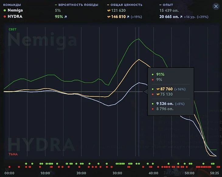 Hydra, проигрывая по ходу карты, уверенно дралась и круто ее перевернула. D+, кстати, давал на победу Hydra всего 9%.