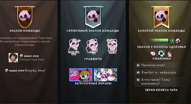 Тоже хороший бандл. «Причина типа» – хороший ответ на очередную растипочку от врагов, а «Я не бот, я нейросеть» – на заезженные оскорбления в паблике. При этом смайлики и загрузочные экраны нарисованы необычно и качественно. Да и стилистика команды подчеркнута – может быть, скоро в первом дивизионе будет еще больше панд!