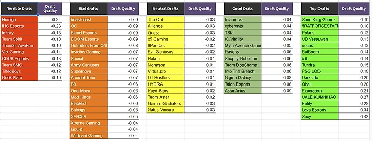 Ну и последняя колонка в таблице, Draft Quality (далее DQ) - это показатель, отвечающий за силу драфта, ради него всё и затевалось. Считается этот показатель следующим образом: