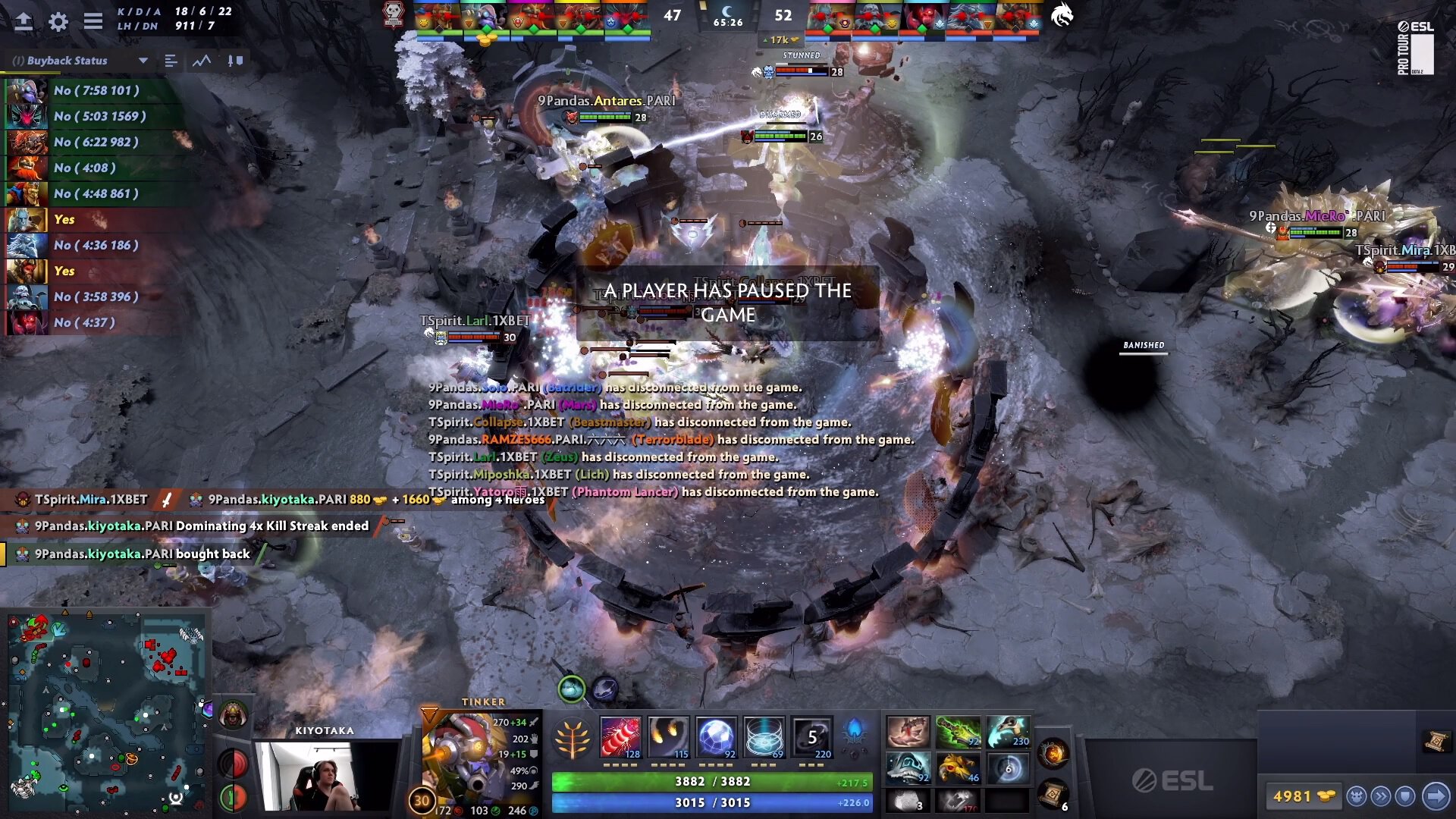 И, хоть шансов у 9Pandas уже практически не было (мегакрипы, огромный Лансер), но надежда была! Тинкер даже купил себе Рефрешер (!), чтобы на базе перезарядить БКБ. Но мы не увидели драку за игру – мы увидели паузы и вылетающую Доту.