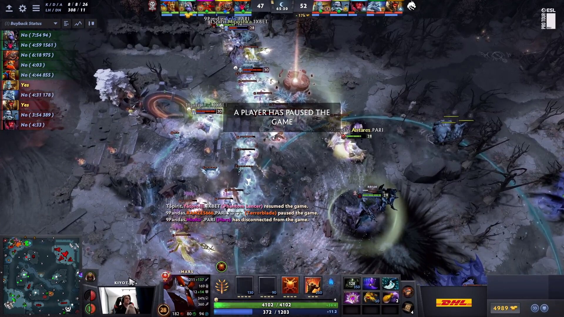 И Миеро не мог вернуться в игру несколько минут, так как у него пропало соединение с сетью Доты.