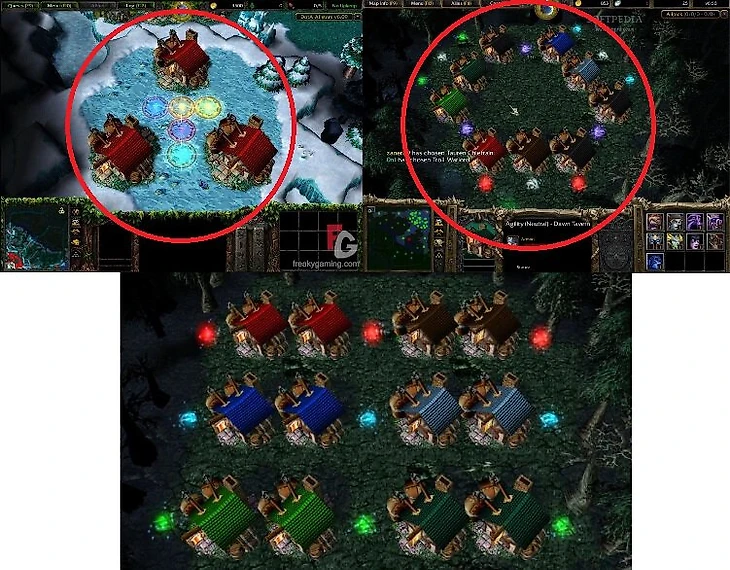 Левая верхняя картинка показывает, что в версии 6.09 у Sentinel и Scourge было по 3 своих таверны. Ведь по лору игры любой персонаж изначально принадлежал либо Sentinel, либо Scourge.
