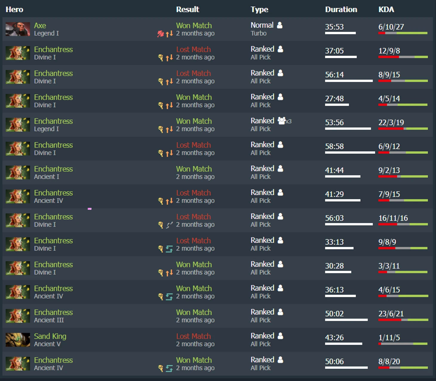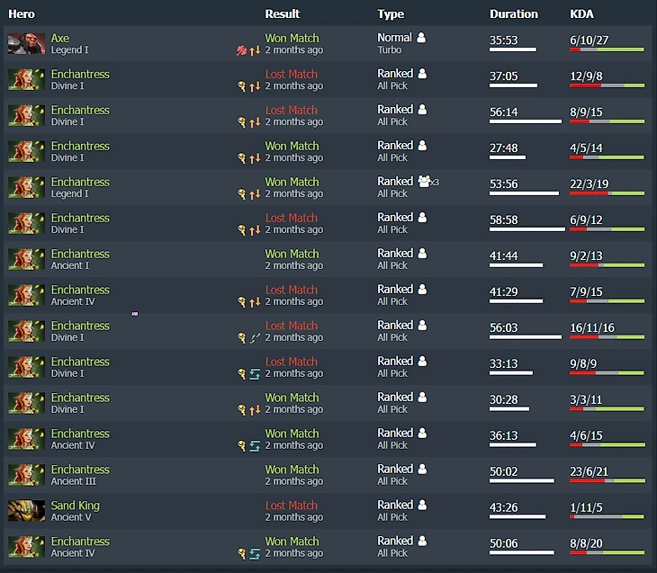 Вышел патч 7.33, я зашел сыграть одну на Enchantress, и у меня пошла калибровка. Решил, что если мне Габен даст 500-600 MMR, как всем вокруг (у меня было 4800), то я буду играть. Я опять на Enchantress сел, а ее никто не банит. Ребята, она до сих пор не пофикшена, она до сих пор нереально сильная! Я брал на четверку или пятерку, у меня DPS больше, чем у керри. Я доиграл калибровку (не знаю, с каким счетом закончил) – мне дали минус 200! И я сказал: «Я больше не зайду в игру, пока у меня опять не появится вот это озарение, пока меня кореша не позовут». Я не знаю, как у других, мне в Доту одному играть очень тяжело. Я переживаю за каждое поражение, я ложусь спать с мыслями о том, мог ли я сыграть лучше, и мне как-то немножко не по себе. Когда есть друзья, которые зовут в анранкед, я получаю от этого удовольствие.