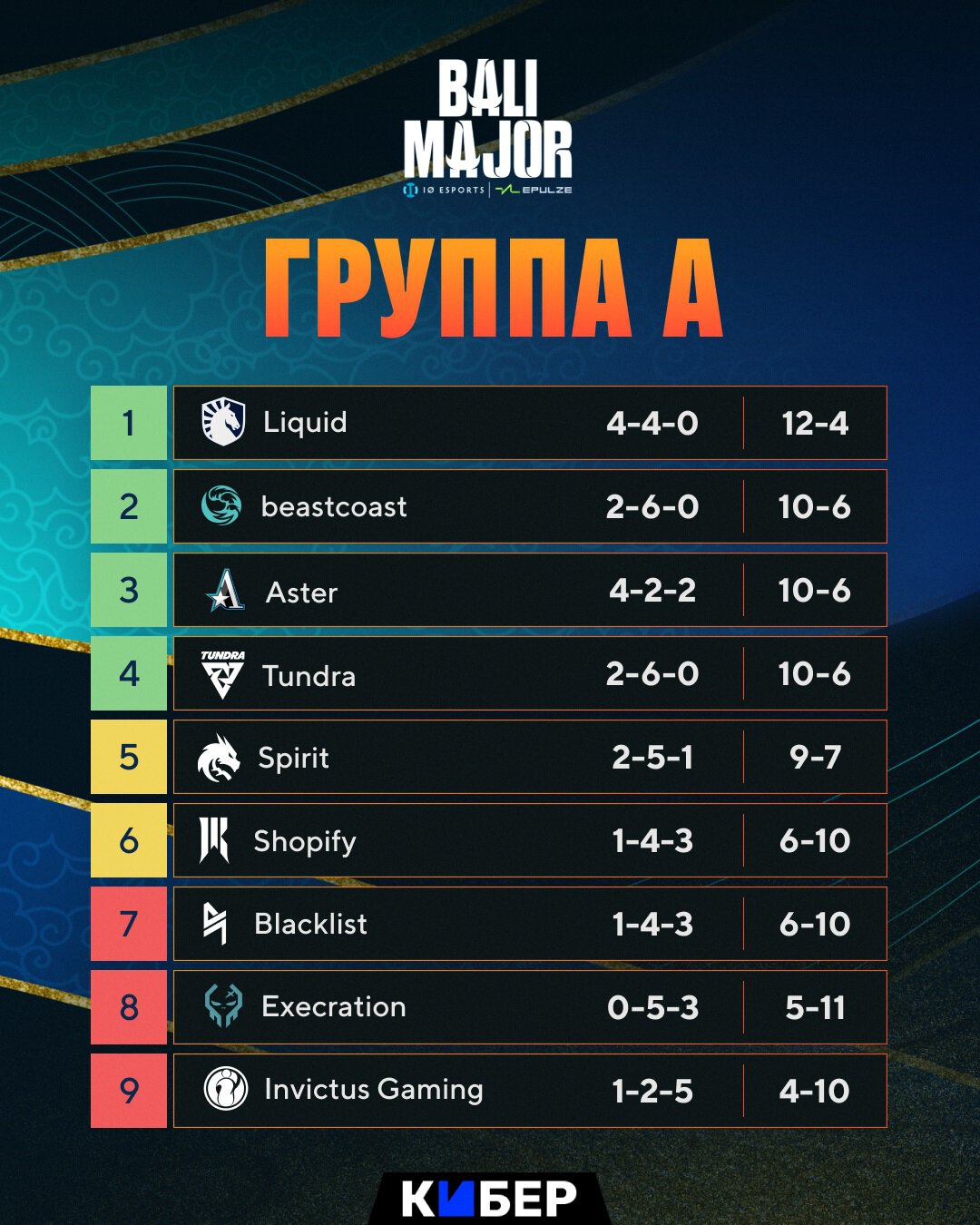 Положение команд после группового этапа. Team Spirit отправляется в нижнюю сетку, а Execration, Blacklist Rivalry и Invictus Gaming покидают турнир.