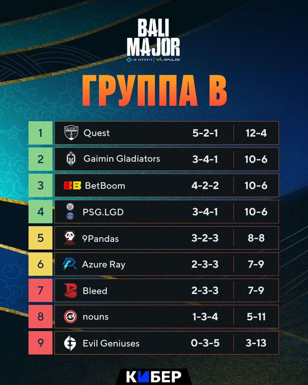 Положение команд после группового этапа. BetBoom начнут плей-офф в верхней сетке, 9Pandas – в нижней. Nouns, Evil Geniuses и Bleed Esports покидают турнир.