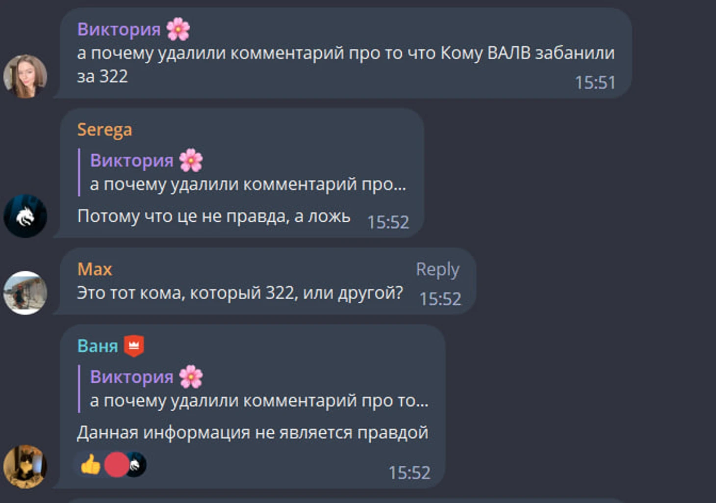 5. Попытка замолчать прошлое Комы от Spirit лишь усугубляет ситуацию. Пока вы читаете этот текст, в комментариях телеграм-канала Spirit идет большое обсуждение, и большинство фраз про бан от Valve удаляют админы.