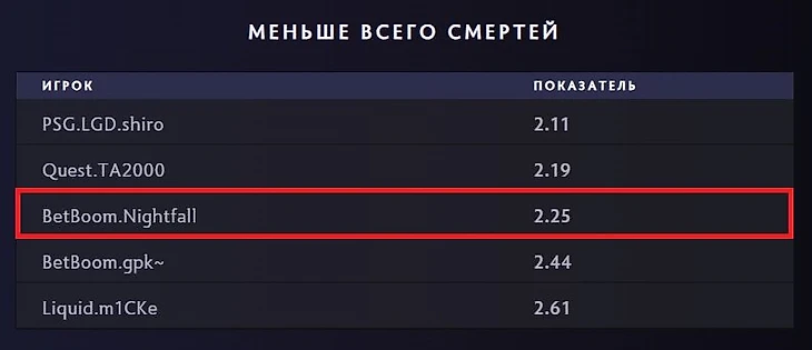 Керри BetBoom Team Nightfall всегда в лидерах по наименьшему количеству смертей на турнирах. Исключением не стал и мейджор на Бали. Долгое время Егор лидировал, но сейчас его немного обошел Shiro, который продолжает славные традиции Аме, и TA2000, пребывающий на мейджоре в прекрасной форме.
