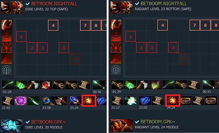 Показательный эпизод из матча против EG. Егор – сильно разогнанный Сикер со Стиком, каплями и лотосом. Он знает, что коры EG только что потратили способности в саппорта и что Gpk стягивается в ответ на перемещение вражеского мидера.