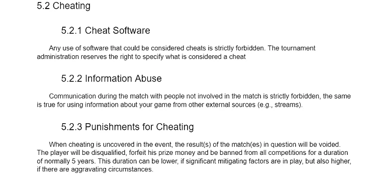 «5.2.2 Злоупотребление информацией Общение во время матча с людьми, не участвующими в матче, строго запрещено, то же самое касается использования информации о вашей игре из других внешних источников (например, стримов). 5.2.3 Наказание за читерство При выявлении факта мошенничества в ходе соревнований результаты соответствующего матча будут аннулированы. Игрок будет дисквалифицирован, лишится призовых денег и будет отстранен от участия во всех соревнованиях на срок, как правило, 5 лет. Этот срок может быть меньше, если имеются значительные смягчающие обстоятельства, но также и больше, если имеются отягчающие обстоятельства».
