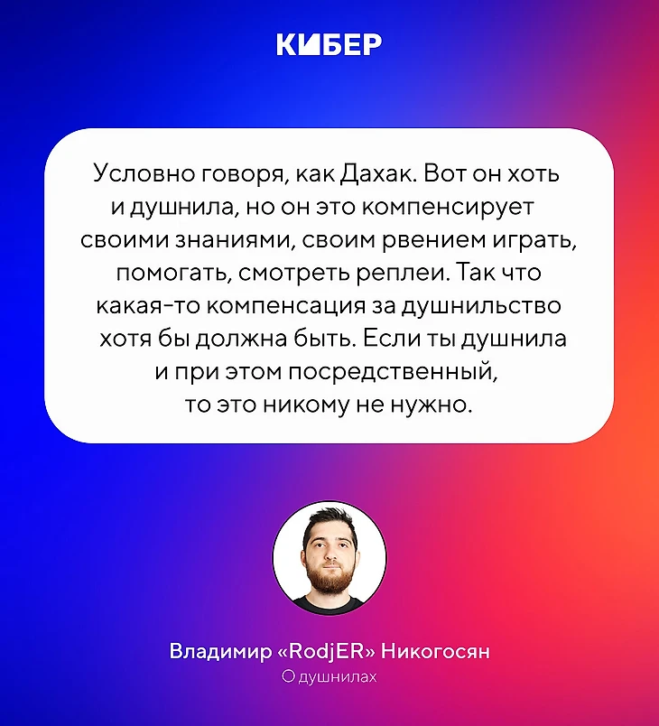 – Лучше, чтобы его не было. Но если уж он есть… Условно говоря, как Дахак. Вот он хоть и душнила, но он это компенсирует своими знаниями, своим рвением играть, помогать, смотреть реплеи. Так что какая-то компенсация за душнильство хотя бы должна быть. Если ты душнила и при этом посредственный, то это никому не нужно.