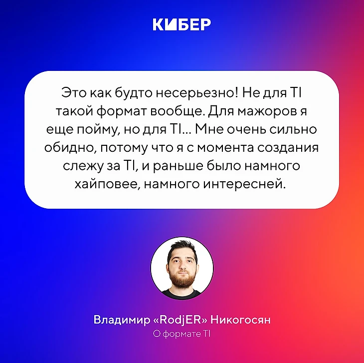 Меня всегда TI на это заряжал, но сейчас как-то… Экономят на нем, что ли. Игр на сцене мало. Раньше нижняя сетка турнира играла на сцене, то есть получала хоть что-то. А сейчас… В этом году только топ-4 команды будут играть на сцене, как и в прошлом. Меня это сильно огорчает. Мне кажется, зрителя тоже, потому что меньше игр на сцене, меньше хайпа, меньше истории. Это как будто несерьезно! Не для TI такой формат вообще. Для мажоров я еще пойму, но для TI… Мне очень сильно обидно, потому что я с момента создания слежу за TI, и раньше было намного хайповее, намного интересней. Даже люди, которые не знают про Доту, смотрели на это и восторгались тем, что вообще происходит.