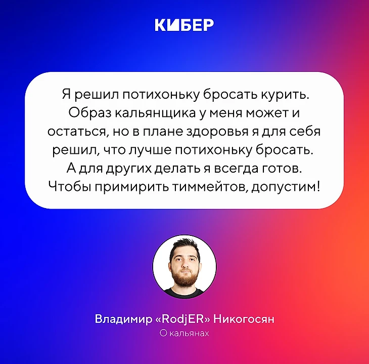 – Я всегда понимал, что кальян – это злая штука в плане здоровья. Когда для себя делаю, я минимум 40 минут курю. А это как пачку сигарет скурить за раз. Сейчас я пытаюсь как-то следить за своим здоровьем в целом, потому что я играю в Доту, а этим образом жизни ты и так его гробишь. А я еще и кальян курю. Я решил, что это неправильно, что я стресс закуриваю. Лучше я буду искать альтернативные варианты. Ну и просто хочу потестировать на своем состоянии, как себя буду чувствовать без этого.