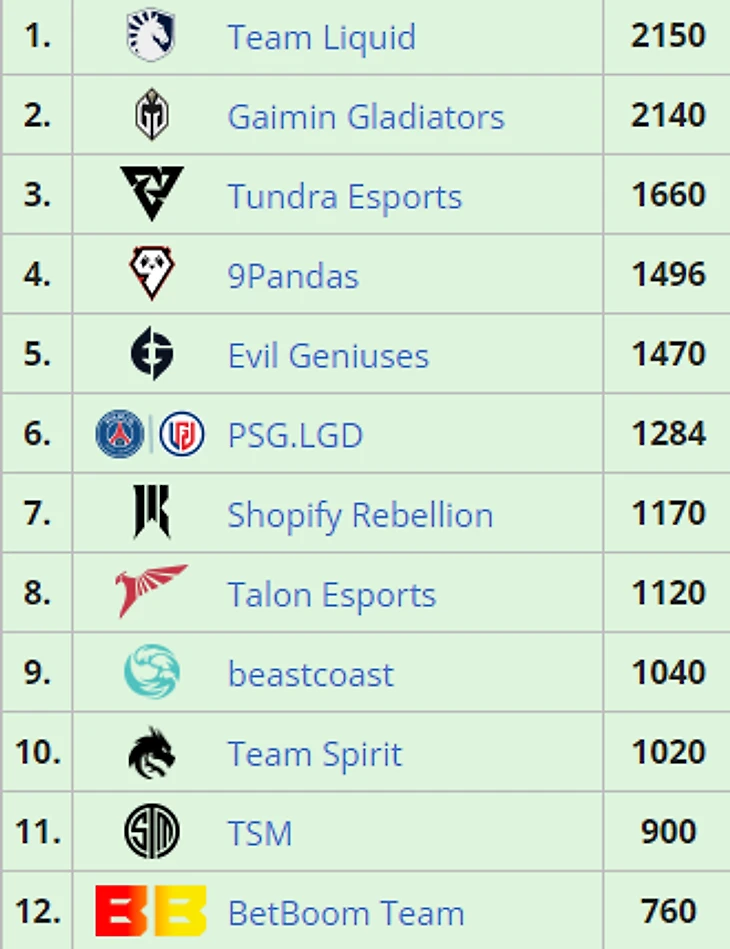 Топ-5 занимают команды Team Liquid, Gaimin Gladiarors, Tundra Esports, 9Pandas и Evil Geniuses.