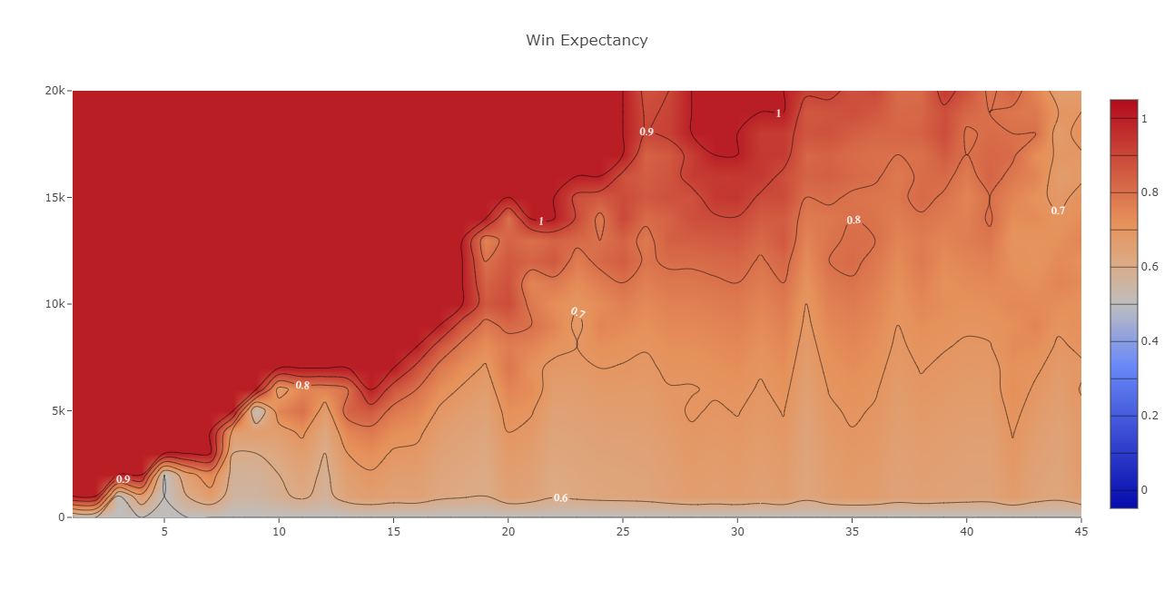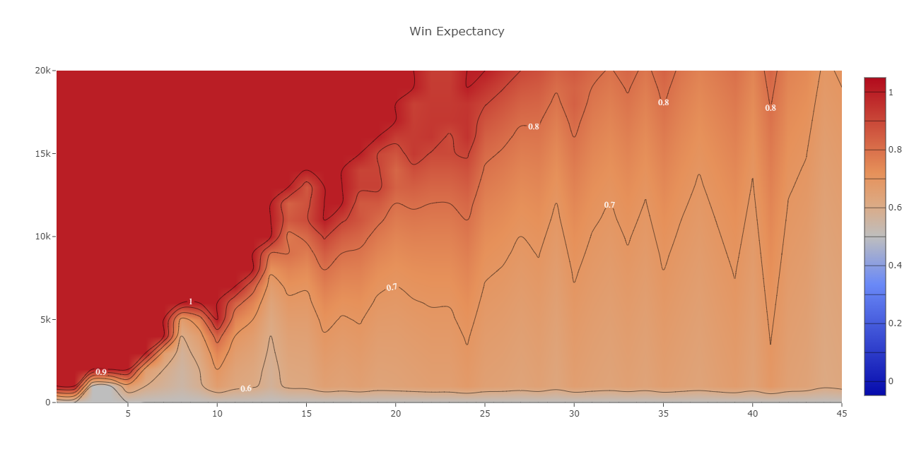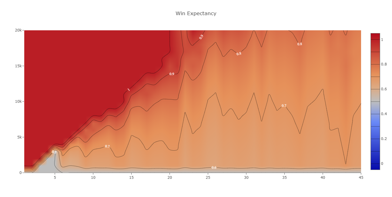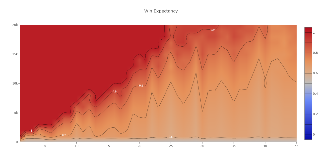 Мы проверили, насколько NS точен в своих суждениях и обратились к Датдоте. Там есть вкладка «Win Expectancy», которая показывает процент матчей, закончившихся победой при определенном перевесе на конкретной минуте.