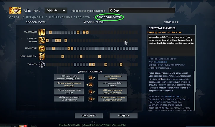 На этом экране задается порядок прокачки способностей и нужные таланты (просто кликайте, чтобы задать порядок). Тут же можно написать описание и советы по использованию способностей.