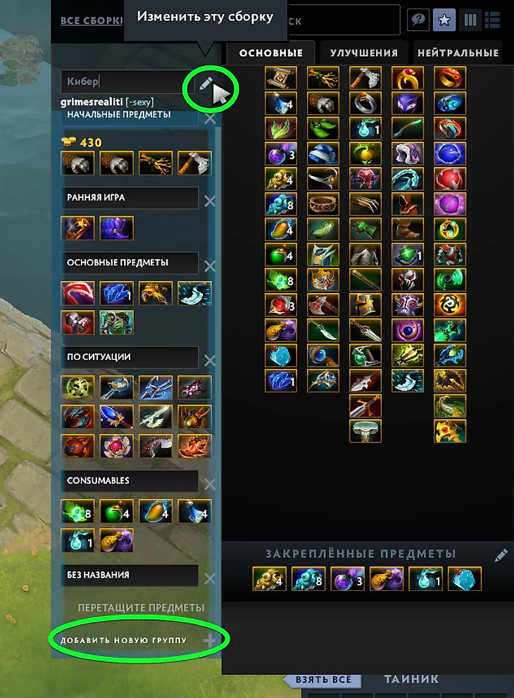 Чтобы изменить закуп сборки нажмите на иконку карандаша справа от названия гайда в магазине, после чего внесите изменения: добавление и удаление предметов делается простым перетаскиваем. Создать новую группу можно, нажав соответствующую кнопку в нижней части экрана.