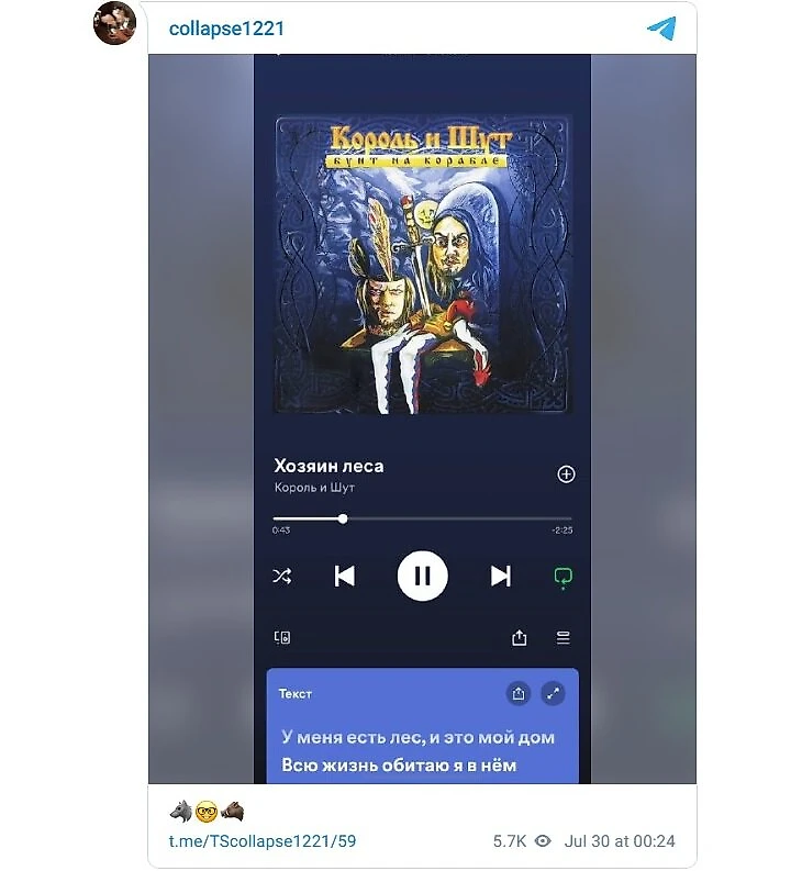 После этого Коллапс запостил в своем мемном телеграм-канале скриншот с песней «Короля и Шута» под названием «Хозяин леса».