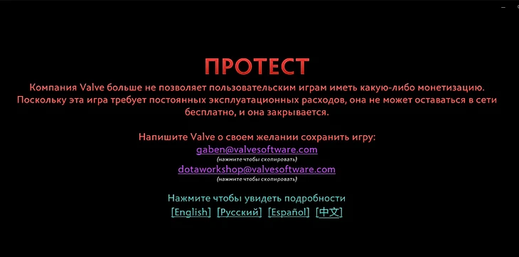«В общем, почти все крупные игры объявляют протест. Он начнется сегодняшней ночью, скорее всего. В них будет невозможно играть, вас будет ждать бесконечная загрузка и экран с текстом. Я поддерживаю этот протест, и Dota 1x6 тоже будет недоступна. Цель протеста – добиться хотя бы возможности монетизировать игры через Steam (как это есть у Auto Chess например). Хотя в нашем случае это выход тоже такой себе, ведь пополнять Steam с России обычными методами сейчас нельзя».