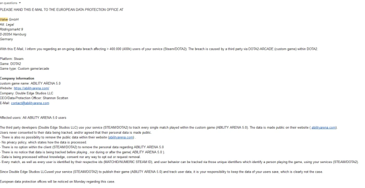 «Оригинальное уведомление о нарушении GDPR (Общего регламента по защите данных ЕС) было отправлено 1 апреля 2023 года напрямую юридическому отделу Valve в Германии. Его можно увидеть здесь: