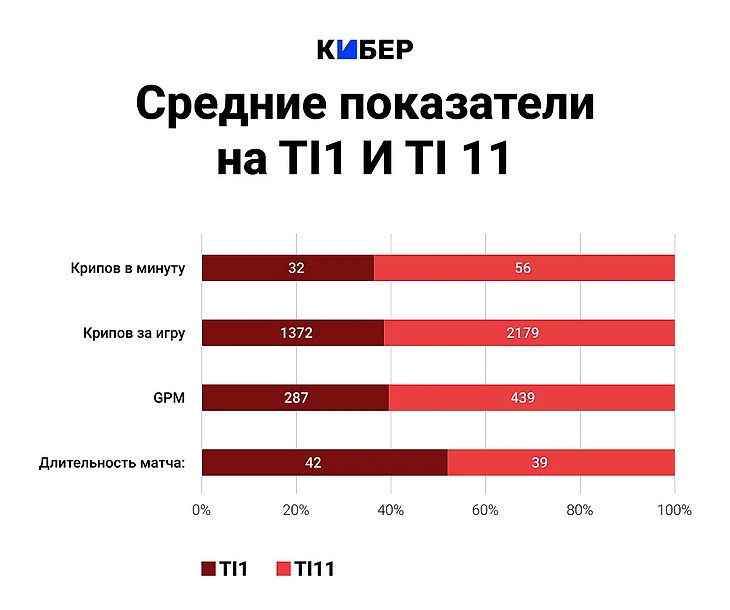 Как проходили матчи в Доте в 2011 году? Команды фармили по 50 минут, а затем в драке 5х5 решали, кто победит. Посмотрите на основные показатели TI1 в сравнении с последним The International.
