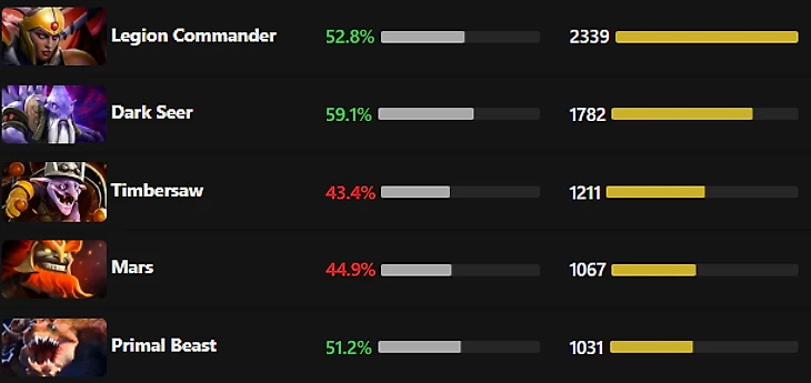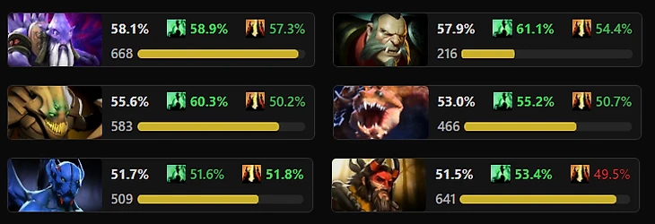 Вот так выглядела пятерка лучших оффлейнеров 7.33e. Выборка взята с пабликов на 7000 и больше MMR: