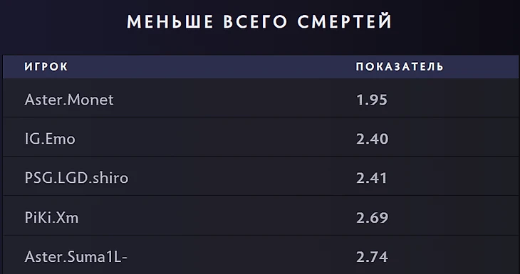 Как следствие – Monet стал игроком с наименьшим количеством смертей в Рияде. Представьте себе, даже Nightfall погибал чаще! А если мы посмотрим статистику летнего тура в Китае, там между Моне и остальными игроками – пропасть.