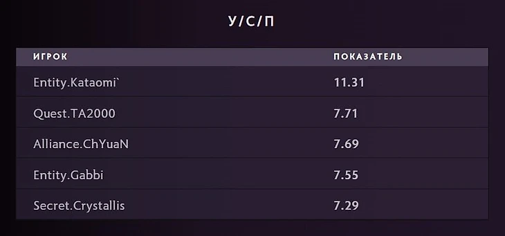 11,31! И это учитывая, что статистику подпортила неудачная карта против Nigma на старте квалификации. Не думаю, что Кристаллис или TA2000 в последний день резко прыгнут на четыре пункта, а ведь они керри-игроки. Кроме лидерства по KDA Владислав еще и: