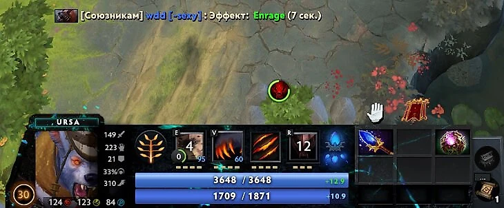 Enrage – 22,5 секунды при длительности в 5. Ну а с поломанным Аганимом ульта перезаряжается всего 12,2 секунды! Скипетр после Октарина – одна из ключевых опций новой сборки;