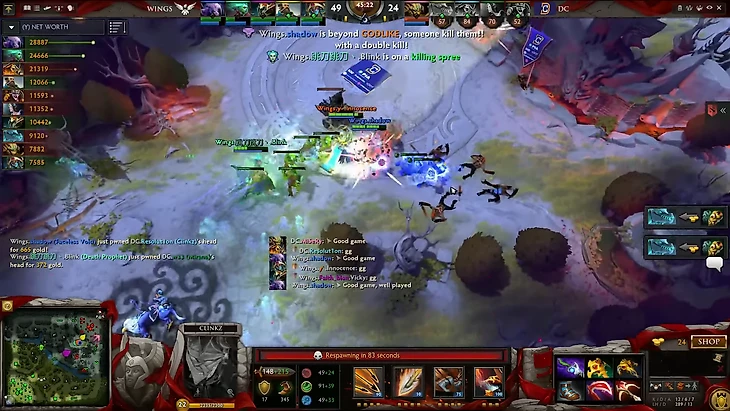 DC заняли хорошую оборону, Клинкзу с Тимбером удалось даже украсть Рошана у Wings, а потом и найти парочку приятных файтов. Это сильно замедлило темп игры, и китайцы после всех внешних вышек не могли просто зайти на базу и закончить игру с большим преимуществом. Но время все равно играло на руку Wings.