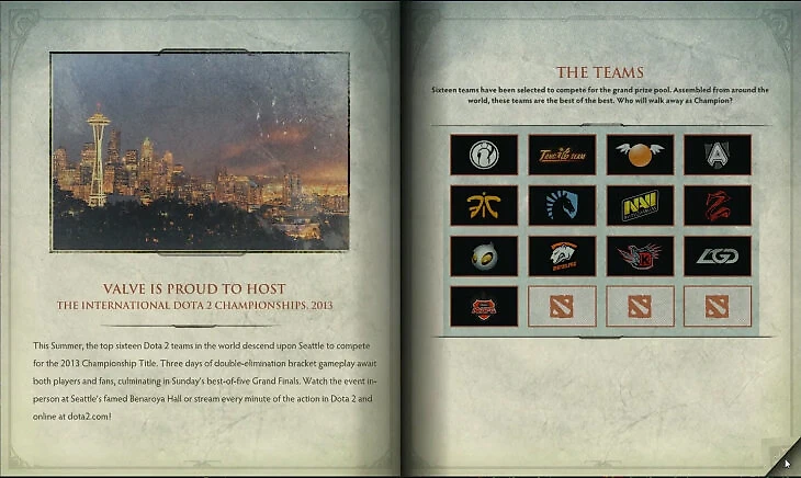 Первый Компендиум – книга со всей информацией о The International 2013 и квалификациях на турнир. Доступ к книге стоил уже привычные $10. Смотреть, сколько это было в рублях в 2013 году, строго не рекомендую – не портите себе настроение.