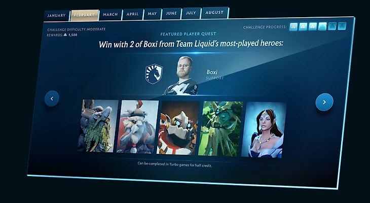 Вы наблюдали за профессионалами, болели за них... Теперь пора играть, как они. Представьте, что вы оказались в геймерском кресле любимого киберспортсмена, и воссоздайте его достижения за прошедший год. Побеждайте за героев из конкретной игры или за тех, на ком конкретный профессионал играл чаще всего в течение месяца. Очки компендиума даются не только за отдельные задания, но и за выполнение всех испытаний, связанных с определенным месяцем.