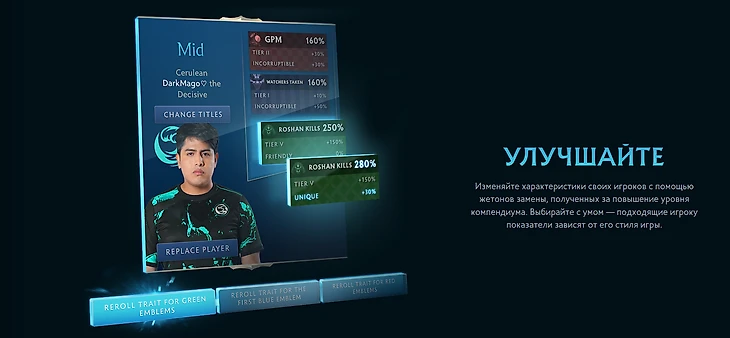 Можно прокачивать характеристики игроков и повышать награду, например, за убийство Рошана.