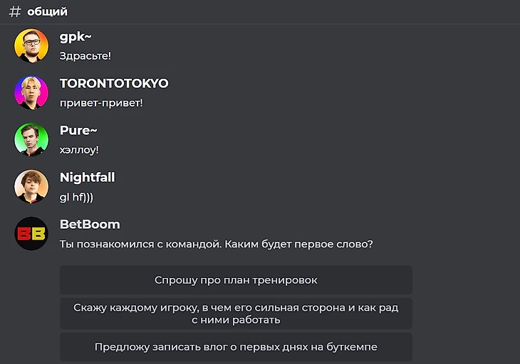 Тебе будут приходить сообщения от игроков: выбирай варианты ответов и принимай решения, когда команде потребуется помощь!