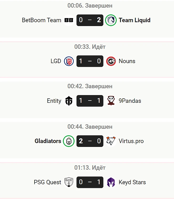 У Spirit и 9Pandas сразу 3 матча (включая очный!), а Virtus.pro сразу же сыграет против Дурачья. У BetBoom сегодня лишь один матч - зато против Liquid!