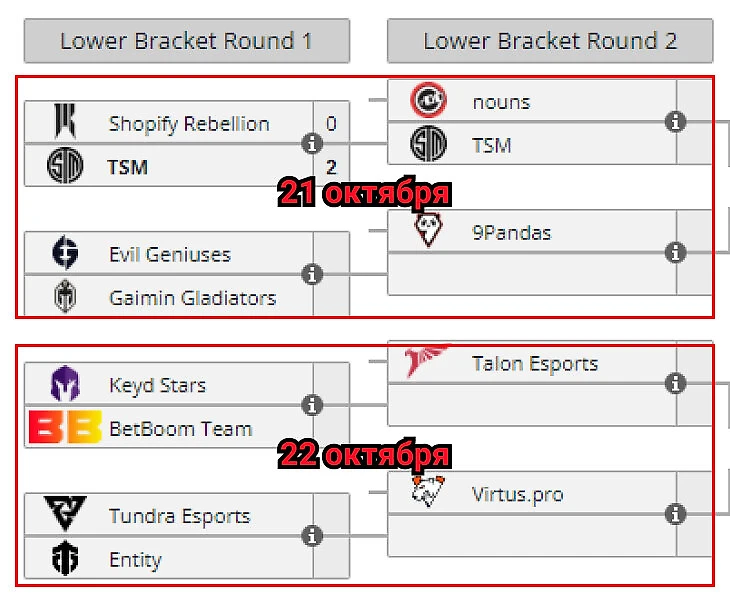 Tundra – Entity начнется 22 октября в 23:00, а матч победителя этой пары с VP – уже через несколько часов. К кому готовиться? К двум сразу? Даже если так, почему у условной Tundra 6 дней на подготовку к двум командам, а у VP – день? Тундра (или Энтити, тут не так важно) узнает о сопернике второго раунда за два дня до игры. Дисбаланс.