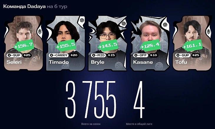 Как и предполагалось, нужно было угадать команды, которые сыграют по две серии. Такими стали GG и TSM, а лучшую команду дня собрали многие пользователи: Seleri, Timado, Bryle, Kasane и Tofu.