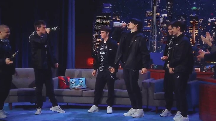 После этого Team Spirit в полном составе заглянула на Late Game [Кибер: «Поздняя катка»], пообливалась и выпила чемпионского шампанского.