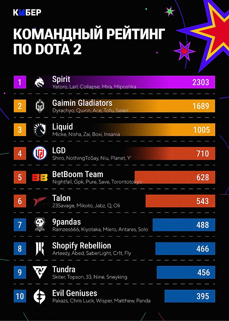 Прошел The International 2023 – Spirit катком проехала по всем противникам и стала двухкратным чемпионом турнира. Несколько дней назад мы выпустили итоговый рейтинг игроков, теперь пора выяснить, какая команда лучшая в мире. Ладно, вы и так знаете, но сможете угадать всю десятку?