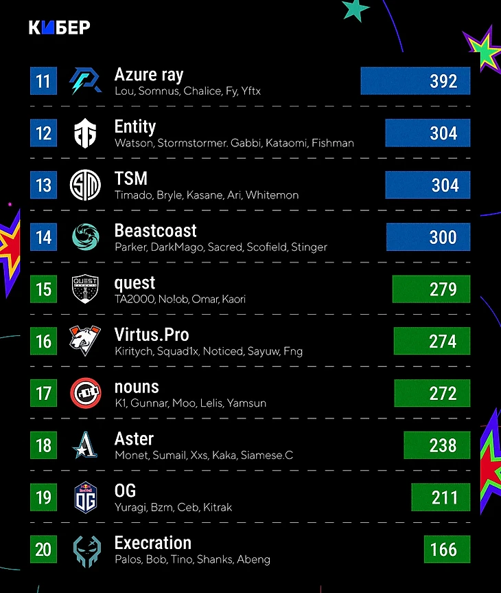 ● 11-я строчка Azure Ray объясняется так же: состав собрался летом, до TI у него был лишь мейджор, сезон в DPC и квалификация к TI. Но прыжок с 24-го на 11-е место – впечатляющий результат!