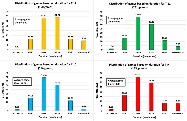 Мета на The International 2023 – самая медленная за последние 4 года. Немного статистики TI12: матчей длительностью 40-50 минут было больше, чем любых других, а матчей короче 20 минут – меньше процента. Ну и среднее время игры, разумеется, самое высокое за последние четыре Инта. Как так?