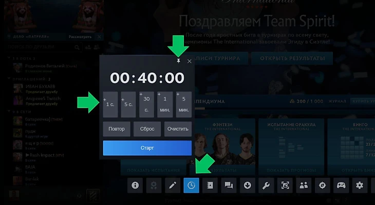 Теперь окно таймера останется в Доте, а поменять время или закрыть его можно в любой момент через тот же оверлей («Shift+Tab»).